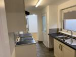The modern refitted kitchen is equipped with a range of base and eye level units, work surfaces, tiled flooring and electric cooker, leading to a stylish, fully tiled bathroom with WC, wash basin, and bath.