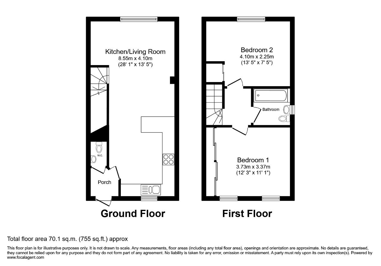 Upstairs, there are two well-proportioned bedrooms, perfectly suited to small families, couples, or individuals, along with a thoughtfully designed bathroom featuring a shower over the bath.