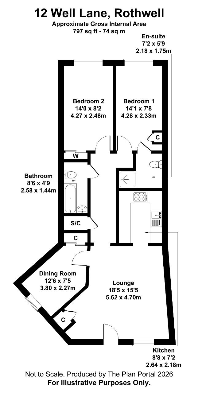 Internally, the property benefits from double glazing and gas-fired central heating via a combination boiler. The layout includes a comfortable lounge, a kitchen fitted with integrated appliances, and two generously sized bedrooms, both featuring built-in wardrobes. The main bedroom is further enhanced by an en-suite shower room, complemented by a separate family bathroom.